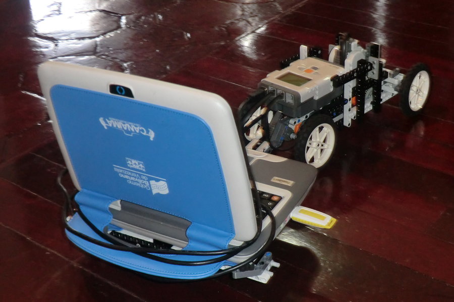 La aplicación de control empleada es la descrita en el post sobre el carro robot, y podemos usarla a través de una sesión ssh. Por otro lado aprovechamos la cámara web integrada en la Canaimita para mostrar en vídeo la vista desde el carro a lo largo de sus movimientos: