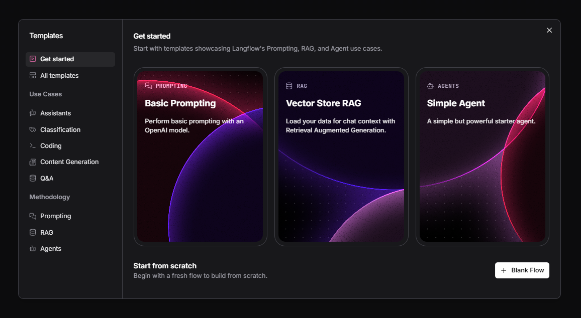 ╰─────────────────────────────────────────────────────────────────────────╯Para abrir la consola de LangFlow en el browser ir a: http://localhost:7860/ La primera vez se verá una pantalla con algunas opciones para iniciar: